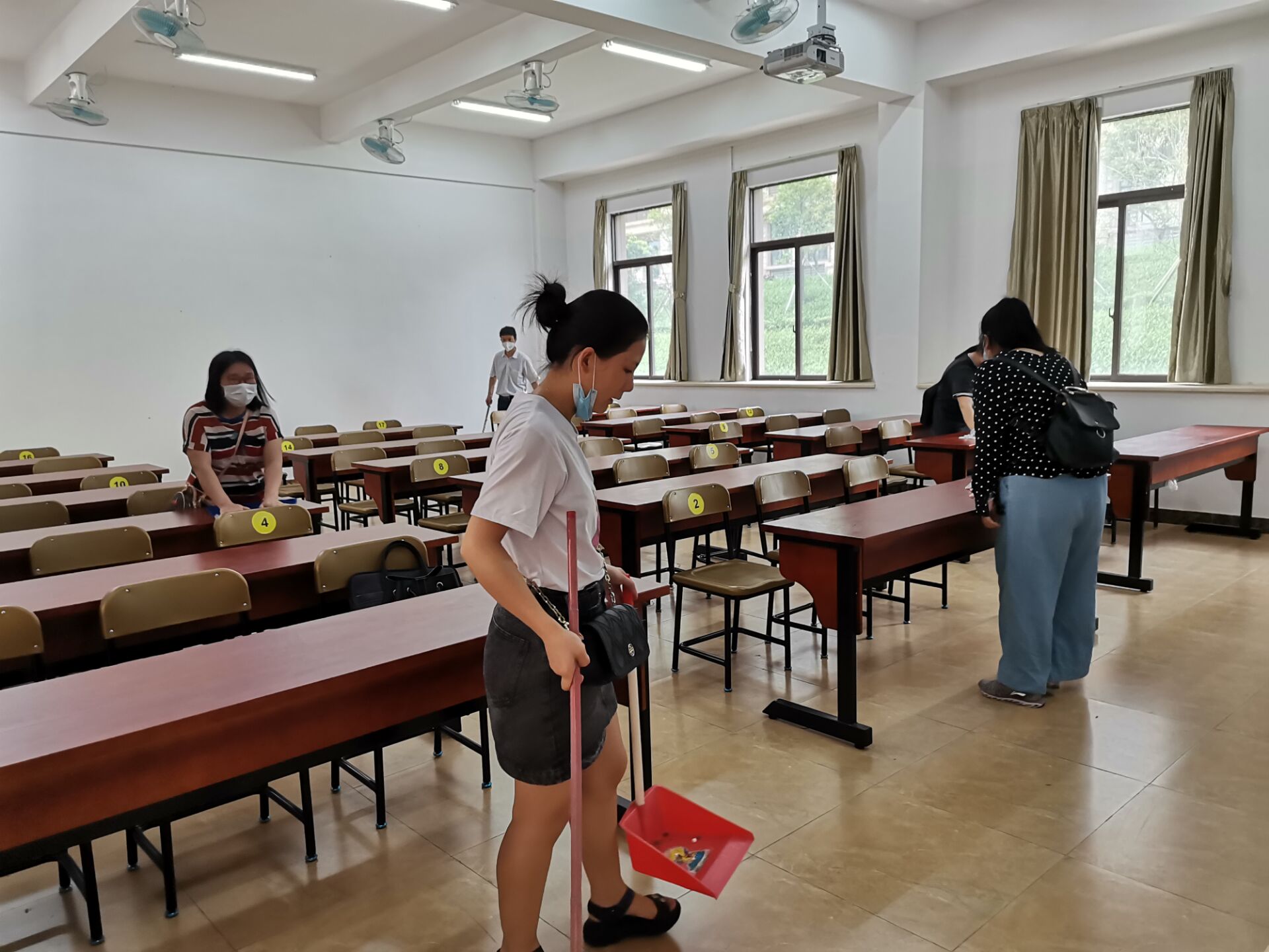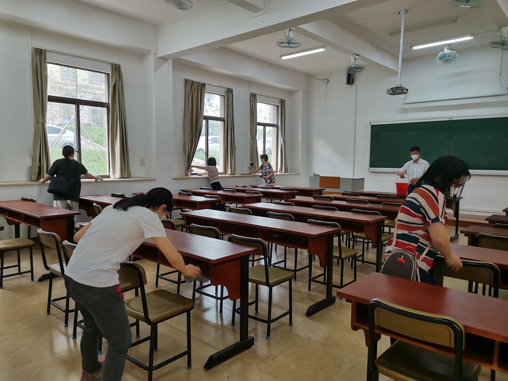 在学院领导的周密部署和精心组织下,教师们从载物楼一开完会,就冒着酷暑立马带着劳动工具来到致知楼,迅速投入到热火朝天的劳动中:有的提水,有的擦桌子,有的擦窗台,有的擦黑板,有的扫地,有的用消毒水拖地……虽然带着口罩,但大家干起活来一点都不含糊。尽管额头上冒出了颗颗汗珠,也顾不上擦一把。在教师们的团结协作和辛勤劳动下,致知楼101和102室也变得一尘不染,在灯光下显得格外耀眼。看着焕然一新的教室,大家心里愉快极了!