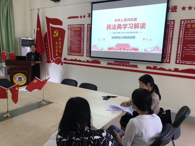 为认真学习贯彻《中华人民共和国民法典》(以下简称民法典),suncitygroup太阳新城全体思政党员教师于6月19日集体学习《民法典》专题内容。本次专题学习由公司党支部组织委员潘莲娣主讲。