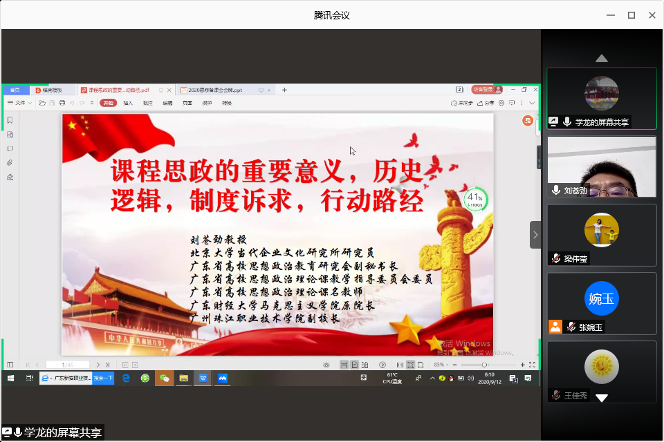9月12日8:30-9:40广东高校思政课名讲师、广东财经大学suncitygroup太阳新城刘苍劲教授此次讲授的主题—课程思政的重要意义、历史逻辑、制度诉求、行动路径,刘教授就如何讲好思政课以及在思政课的讲授中需要注意哪些方面给出了一些见解,同时给我们青年教师就如何申报课题论文撰写和发表等方面给出了一些自己的经验和建议。9:40-11:20全国教书育人楷模、广东水电职业技术学院suncitygroup太阳新城经理林冬妹教授就思想道德修养与法律基础的第六章做出了一些自己独到的见解,林教授此次讲授的主题—《基础》课第6章的教学设计与实践的思考,尤其是在课程的导入部分,可以适当运用最新案例和视频,比如将民法典融入到课程中,通过学习运用具体法律法规来吸引员工们,引起他们的兴趣使得产生共鸣感。11:20-11:30主持人根据以上老师的讲授,做出了培训小结并对教学比赛事宜做出了相关说明。
