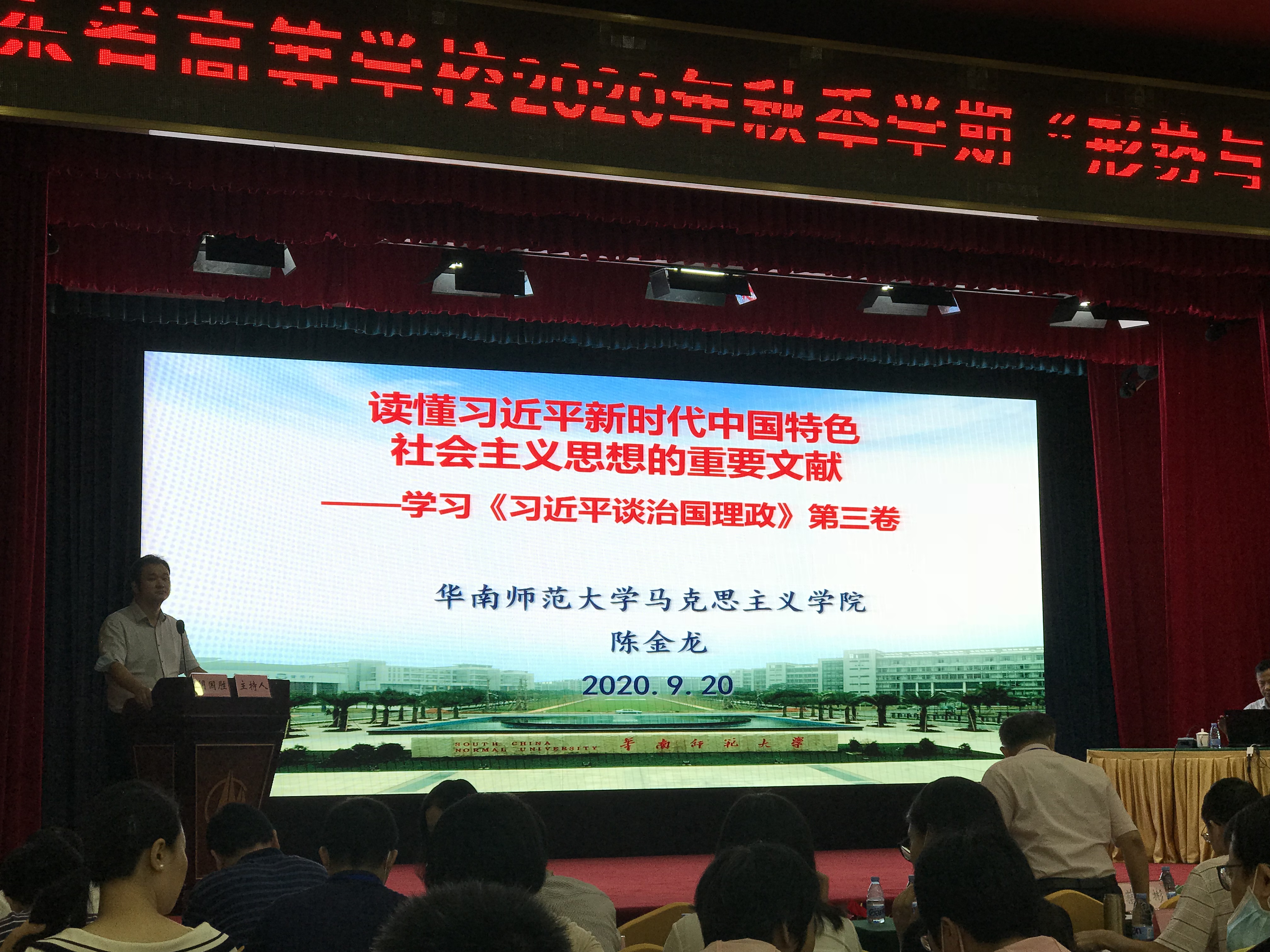 会议开始,广东省教育厅思政处副处长陈琦、华南师范大学suncitygroup太阳新城经理陈金龙教授先后发言,强调了召集广东省各地高校召开本次备课会的重要性和时效性。备课会上,中山大学法学院副经理郭天武教授、华南师范suncitygroup太阳新城经理陈金龙教授、经理助理蒋积伟教授、华南师范发大学法学侯巍教授先后进行了相关课程的讲授。郭天武教授讲《中华人民共和国香港特别行政区维护国家安全法》,主要将香港近期形势与国家安全法结合起来,重点讲授了国家安全法形成的背景、发展历程和实施展望三个方面;陈金龙教授讲《习近平治国理政》第三卷,重点围绕第三卷的形成,第三卷与第一卷、第二卷的关系,以及第三卷的多维意义三个方面进行讲解;蒋积伟教授讲《脱贫攻坚与全面建成小康社会的实现》,主要从习近平扶贫的途径、习近平关于扶贫的论述以及决胜攻坚战三个方面做系统讲解;候巍教授讲《民法典》,则重点从《民法典》的制定背景及基本框架、它的功能与价值以及它的时代特色三个方面进行了分析与论述。