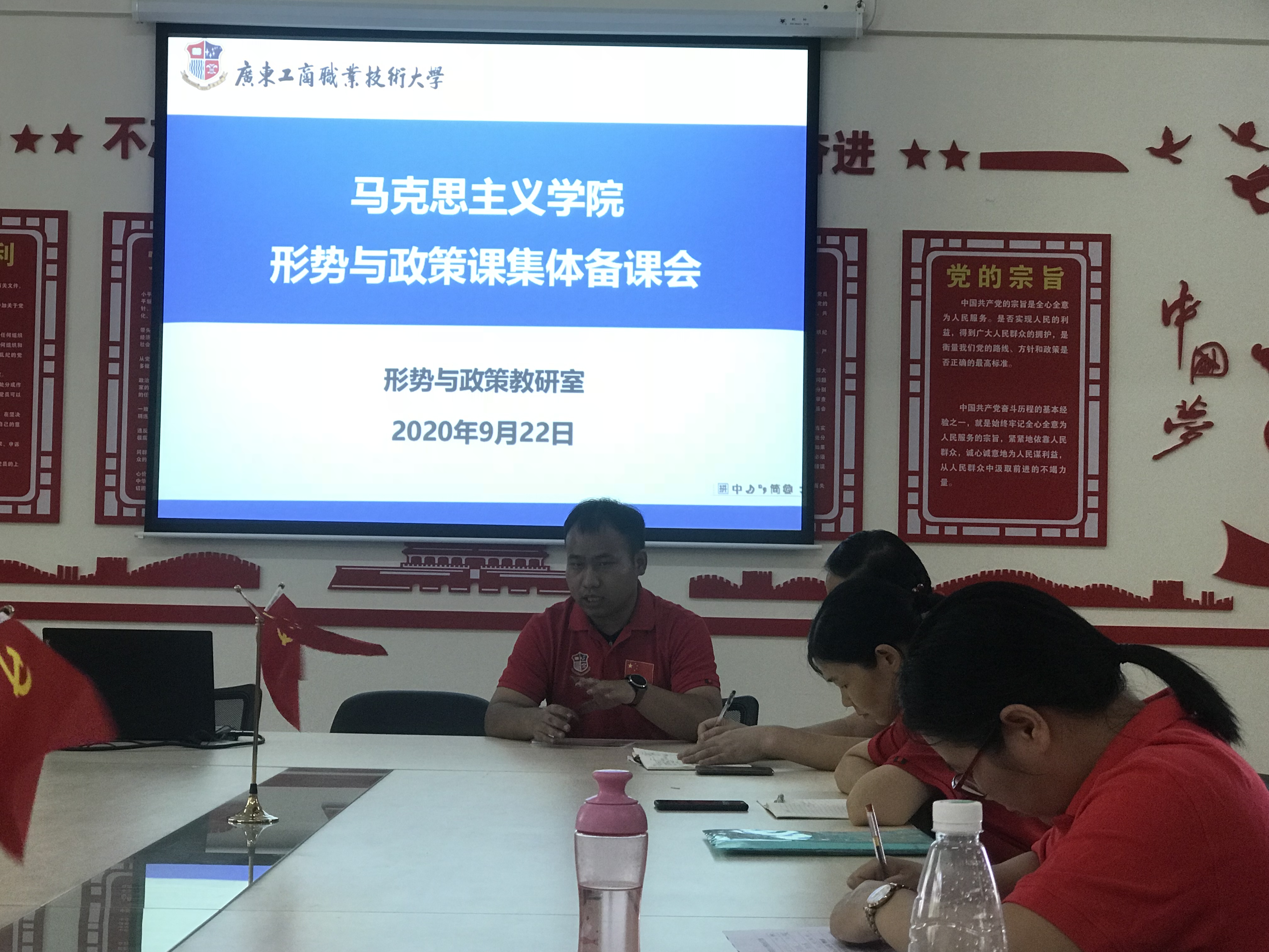 首先,由形势教研室负责人蒙裕老师主讲,开展“形势与政策”课集体备课。蒙老师主要对广东省高等学校2020年秋季学期“形势与政策”课备课会的会议精神、专题内容做解读,随后陈新老师做个人分享。通过回顾和分享,使备课会有效传达了广东省教育厅思政处副处长陈琦和教育部长江学者特聘教授陈金龙的重要讲话精神,让形势与政策课教师对《中华人民共和国香港特别行政区维护国家安全法》、《习近平治国理政》第三卷《脱贫攻坚与全面建成小康社会的实现》和《民法典》的相关内容有了初步的基本的了解。强调会后进一步学习专题课件,增强形势与政策课教师的集体备课意识,强化教师的实践探索和教学纪律教育观念。
